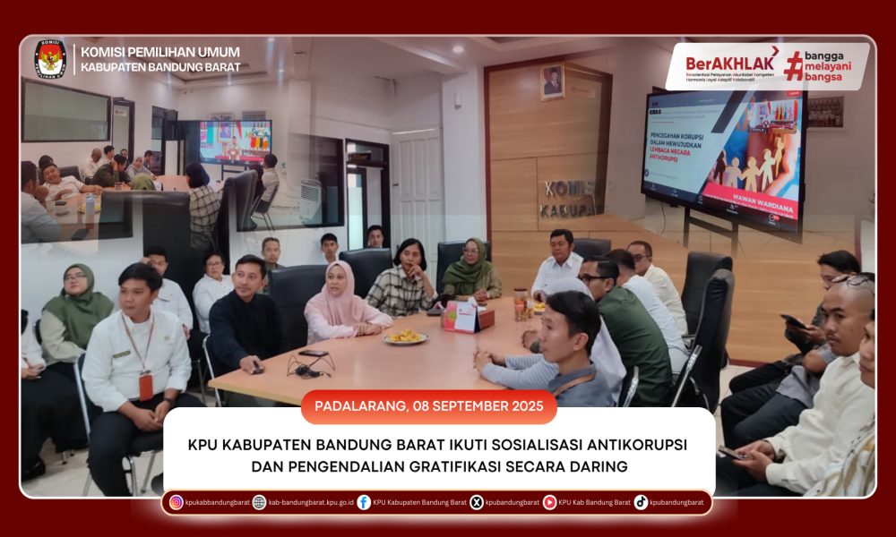 KPU BANDUNG BARAT - Komisi Pemilihan Umum (KPU) Kabupaten Bandung Barat mengikuti kegiatan Sosialisasi Antikorupsi dan Pengendalian Gratifikasi yang diselenggarakan oleh KPU Republik Indonesia pada Senin (08/09/2025). Kegiatan ini diikuti secara daring bersama KPU Provinsi serta KPU Kabupaten/Kota se-Indonesia.