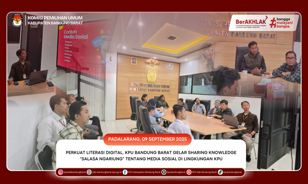KPU BANDUNG BARAT - Komisi Pemilihan Umum (KPU) Kabupaten Bandung Barat kembali menyelenggarakan kegiatan rutin Sharing Knowledge “Salasa Ngariung” yang kali ini mengangkat tema Media Sosial di Lingkungan KPU. Acara digelar pada Selasa (09/09/2025) bertempat di Ruang Rapat Bayu Baskoro dan diikuti oleh jajaran pejabat serta pegawai KPU Bandung Barat.