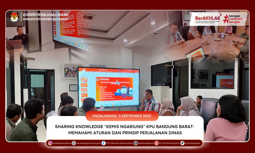 KPU BANDUNG BARAT - Komisi Pemilihan Umum (KPU) Kabupaten Bandung Barat kembali menyelenggarakan kegiatan rutin Sharing Knowledge “Kemis Ngariung” pada Kamis (11/09/2025) di Ruang Rapat Bayu Baskoro. Kegiatan sharing knowledge ini sudah berjalan sampai seri Ke-17. Kegiatan ini diikuti oleh Sekretaris KPU Kabupaten Bandung Barat, Olina Theresia Santi Dewi, para Kepala Subbagian (Kasubag), serta jajaran staf yang terdiri dari PNS, PPPK, PPNPN, dan CPNS.