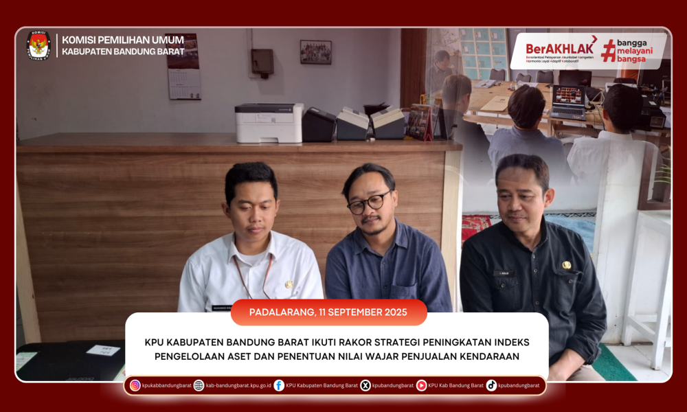 KPU BANDUNG BARAT - Komisi Pemilihan Umum (KPU) Kabupaten Bandung Barat melalui pegawai Sub Bagian Keuangan, Umum, dan Logistik mengikuti Rapat Koordinasi (Rakor) Strategi Meningkatkan Nilai Indeks Pengelolaan Aset dan Penentuan Nilai Wajar Penjualan Kendaraan pada Kamis, 11 September 2025. Kegiatan ini dilaksanakan secara daring dan diikuti oleh seluruh satuan kerja KPU se-Indonesia. Kegiatan ini dilaksanakan berdasarkan Surat Sekretaris Jenderal Republik Indonesia Nomor 1239/RT.01-Und/05/2025.
