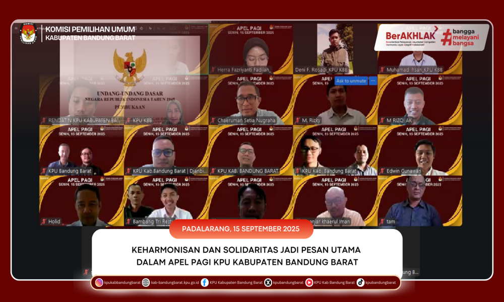 KPU BANDUNG BARAT - Komisi Pemilihan Umum (KPU) Kabupaten Bandung Barat melaksanakan apel pagi rutin pada Senin (15/9), yang digelar secara daring melalui aplikasi Zoom. Kegiatan ini diikuti oleh seluruh pegawai, dengan susunan acara meliputi pembukaan, pembacaan Pancasila, pembacaan UUD 1945, amanat pembina apel, serta dokumentasi.