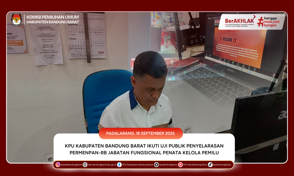 KPU BANDUNG BARAT - Komisi Pemilihan Umum (KPU) Republik Indonesia menyelenggarakan kegiatan Uji Publik Penyelarasan Peraturan Menteri Pendayagunaan Aparatur Negara dan Reformasi Birokrasi (PermenPAN-RB) Nomor 1 Tahun 2023 tentang Jabatan Fungsional Penata Kelola Pemilu, pada Kamis (18/9/2025). Kegiatan yang dilaksanakan secara hybrid, yakni luring di Hotel Grand Mercure Harmoni Jakarta dan daring melalui Zoom Meeting, diikuti oleh satuan kerja KPU dari seluruh Indonesia.