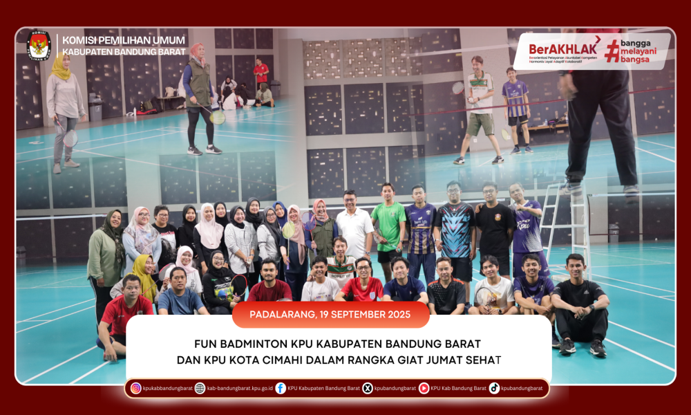 KPU BANDUNG BARAT - KPU Kabupaten Bandung Barat menggelar kegiatan olahraga bersama dengan KPU Kota Cimahi melalui ajang Fun Badminton pada Jumat (19/9/2025) di Bumi Pancasona, Kota Baru Parahyangan. Kegiatan ini menjadi salah satu bentuk implementasi dari program Giat Jum’at Sehat yang rutin dilaksanakan oleh KPU Kabupaten Bandung Barat setiap pekan.
