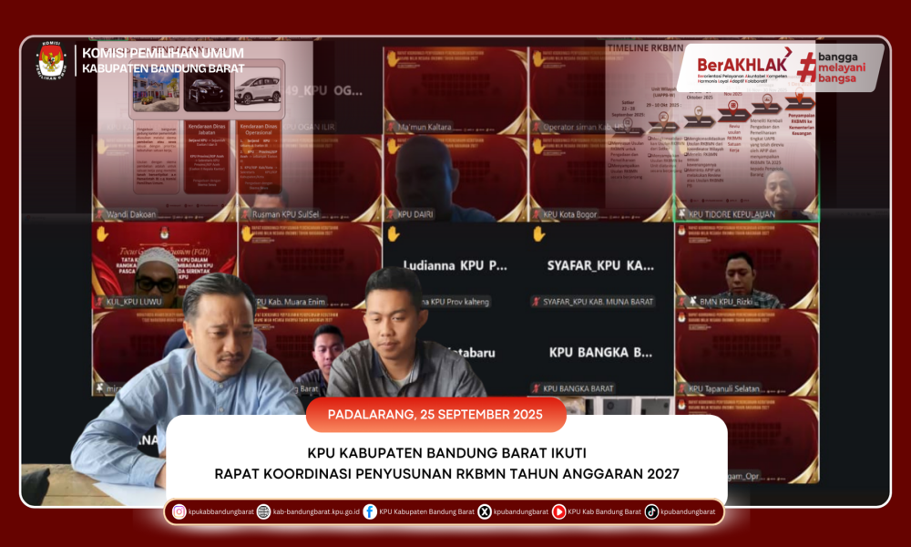 KPU BANDUNG BARAT - Komisi Pemilihan Umum (KPU) Kabupaten Bandung Barat mengikuti Rapat Koordinasi Penyusunan Perencanaan Kebutuhan Barang Milik Negara (RKBMN) Tahun Anggaran 2027 yang diselenggarakan secara daring oleh KPU Republik Indonesia pada Kamis, 25 September 2025.