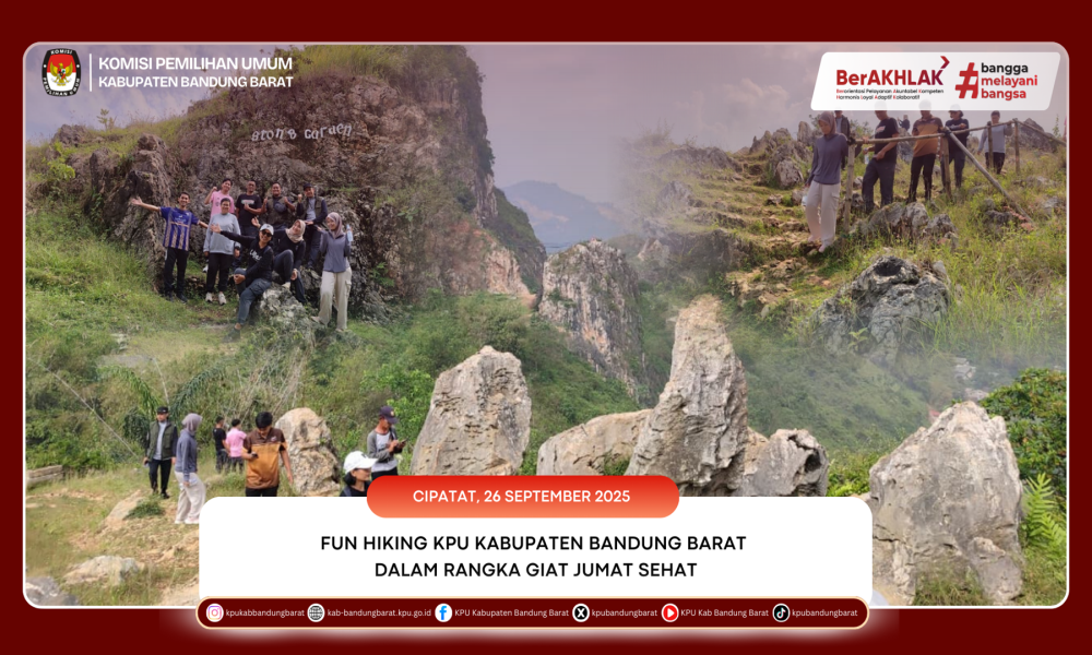 KPU BANDUNG BARAT - Komisi Pemilihan Umum (KPU) Kabupaten Bandung Barat kembali melaksanakan kegiatan rutin Giat Jum’at Sehat dengan menggelar Fun Hiking pada Jumat, 26 September 2025. Bertempat di kawasan wisata alam Stone Garden Citatah, kegiatan ini diikuti oleh pegawai KPU Kabupaten Bandung Barat dengan penuh antusias.