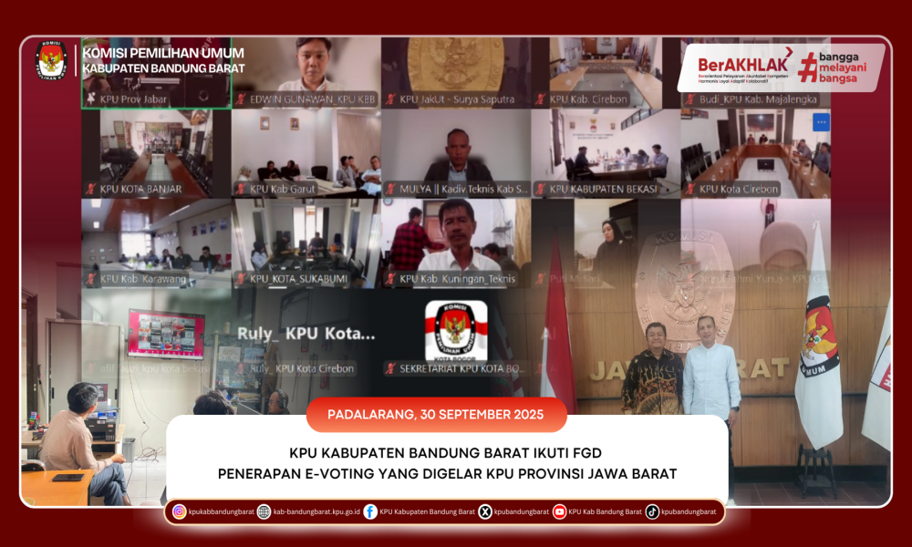 KPU BANDUNG BARAT - Komisi Pemilihan Umum (KPU) Kabupaten Bandung Barat melalui Sub Bagian Teknis Penyelenggaraan Pemilu dan Hukum mengikuti kegiatan Focus Group Discussion (FGD) yang digelar oleh KPU Provinsi Jawa Barat pada Selasa (30/9/2025). FGD ini mengangkat tema “Penerapan E-Voting dalam Pemilu dan Pemilihan Serentak: Perspektif Regulasi, Teknologi, dan Kepercayaan Publik.”