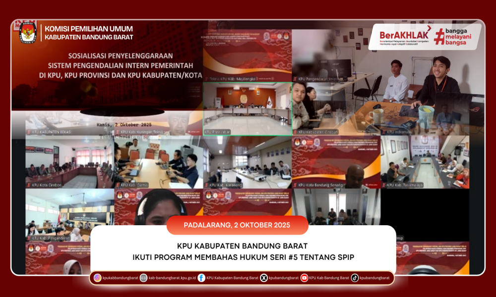 KPU BANDUNG BARAT - Komisi Pemilihan Umum (KPU) Kabupaten Bandung Barat melalui Subbagian Teknis Penyelenggaraan Pemilu dan Hukum mengikuti kegiatan Program Membahas Hukum (MH) Seri #5 yang digelar oleh KPU Provinsi Jawa Barat pada Kamis (2/10/2025). Kegiatan ini diselenggarakan secara daring melalui aplikasi Zoom dengan topik utama pembahasan mengenai Sistem Pengendalian Internal Pemerintah (SPIP).