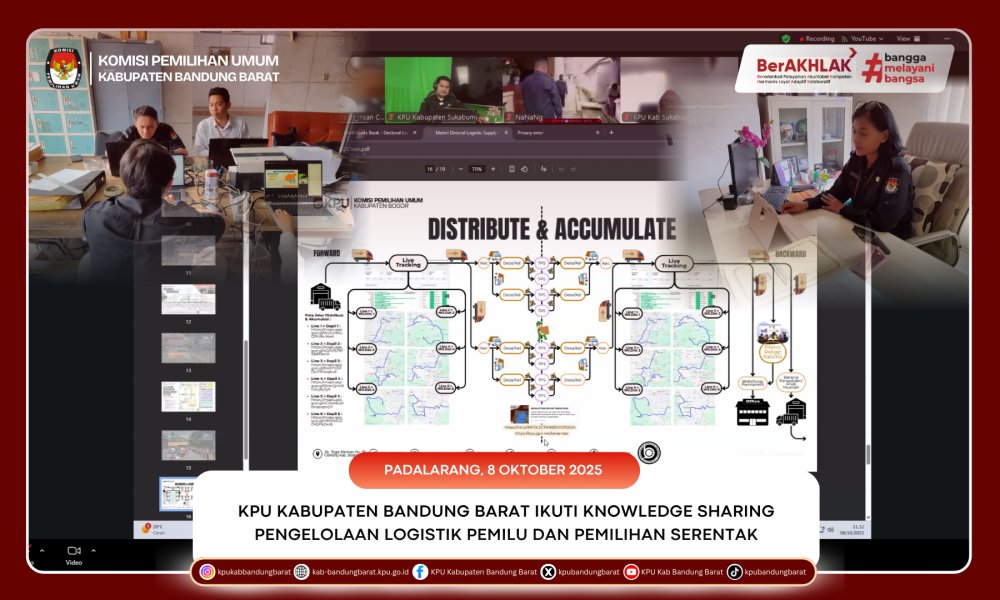 KPU BANDUNG BARAT - Komisi Pemilihan Umum (KPU) Kabupaten Bandung Barat mengikuti kegiatan Knowledge Sharing bertajuk “Pengelolaan Logistik Pemilu dan Pemilihan Serentak” yang diselenggarakan oleh KPU Kabupaten Sukabumi bekerja sama dengan KPU Kabupaten Bogor dan KPU Kabupaten Murung Raya. Kegiatan ini berlangsung secara daring pada Rabu (8/10/2025) dan diikuti oleh Sekretaris KPU Kabupaten Bandung Barat, Olina Theresia Santi Dewi, beserta jajaran Subbag Keuangan, Umum dan Logistik, serta CPNS di lingkungan sekretariat.