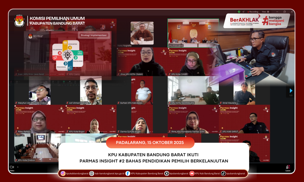 KPU BANDUNG BARAT - Komisi Pemilihan Umum (KPU) Kabupaten Bandung Barat mengikuti kegiatan Parmas Insight Chapter #2 yang diselenggarakan oleh KPU Provinsi Jawa Barat pada Rabu, 15 Oktober 2025, secara daring. Kegiatan ini diikuti oleh Kasubbag Partisipasi, Hubungan Masyarakat, dan SDM, Chaeruman Setia Nugraha, serta staf subbagian terkait.