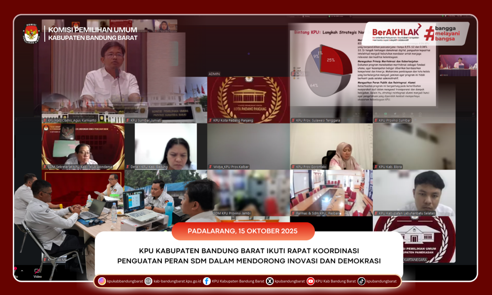 KPU BANDUNG BARAT - KPU Kabupaten Bandung Barat mengikuti kegiatan Rapat Koordinasi Penguatan Peran SDM dalam Mendorong Inovasi dan Demokrasi yang diselenggarakan secara daring pada tanggal 13-15 Oktober 2025. Kegiatan ini diikuti oleh seluruh satuan kerja KPU se-Indonesia dengan tujuan memperkuat kapasitas sumber daya manusia dalam mendukung inovasi kelembagaan serta menjaga kualitas demokrasi di tanah air.