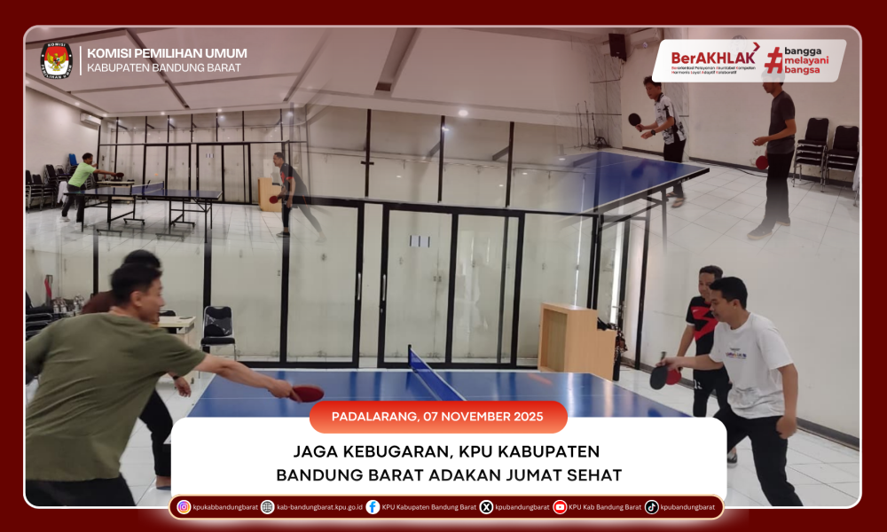 Melalui kegiatan Jumat Sehat, KPU Kabupaten Bandung Barat berupaya menumbuhkan semangat kebersamaan sekaligus menjaga kebugaran jasmani di tengah padatnya aktivitas kerja, khususnya dalam persiapan tahapan Pemilu mendatang. Pada kesempatan kali ini, olahraga yang dipilih adalah tenis meja atau pingpong, yang dimainkan secara bergiliran oleh para pegawai di aula kantor KPU.