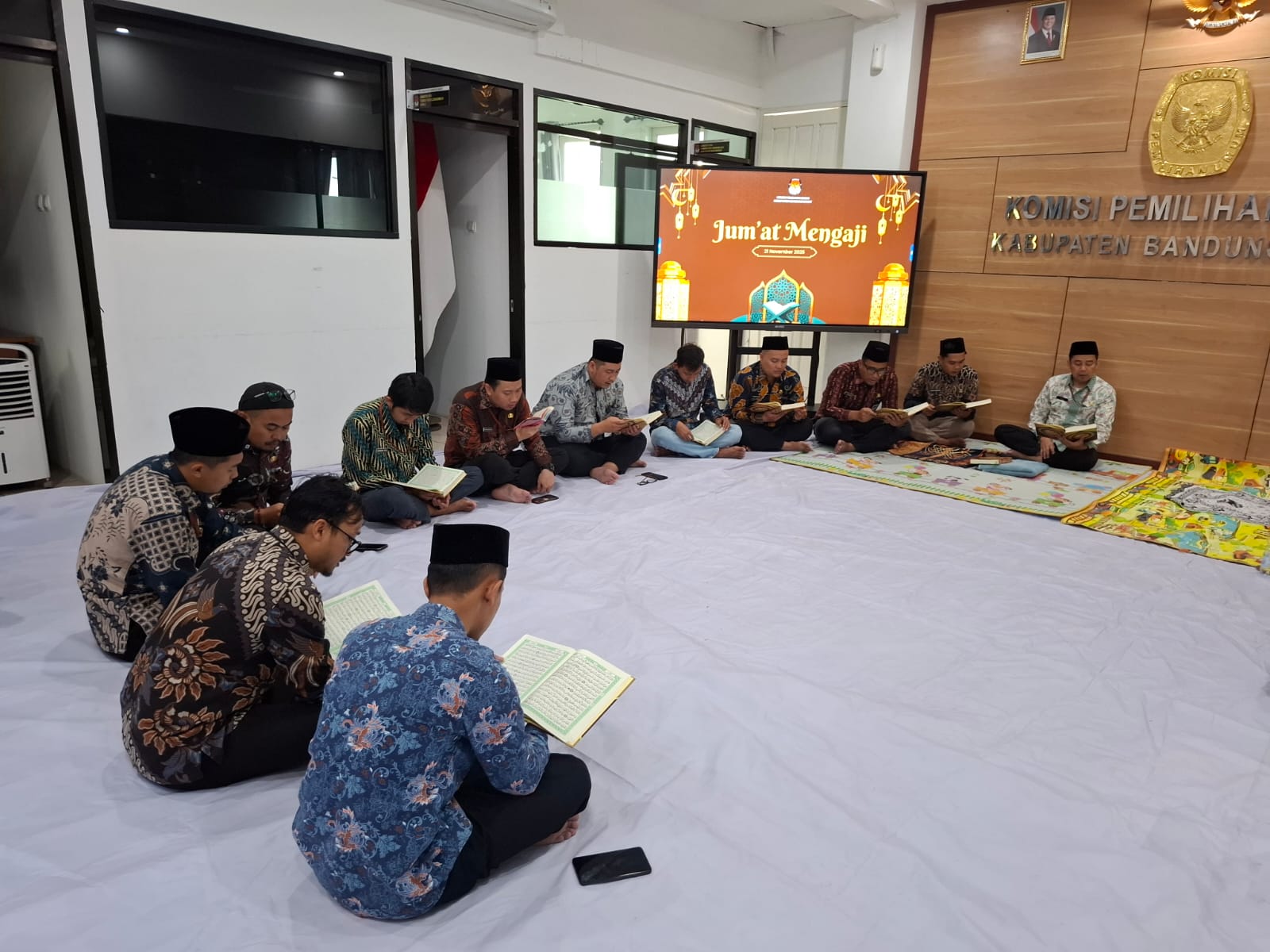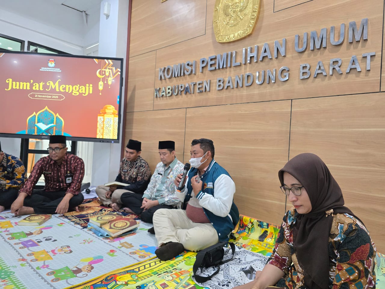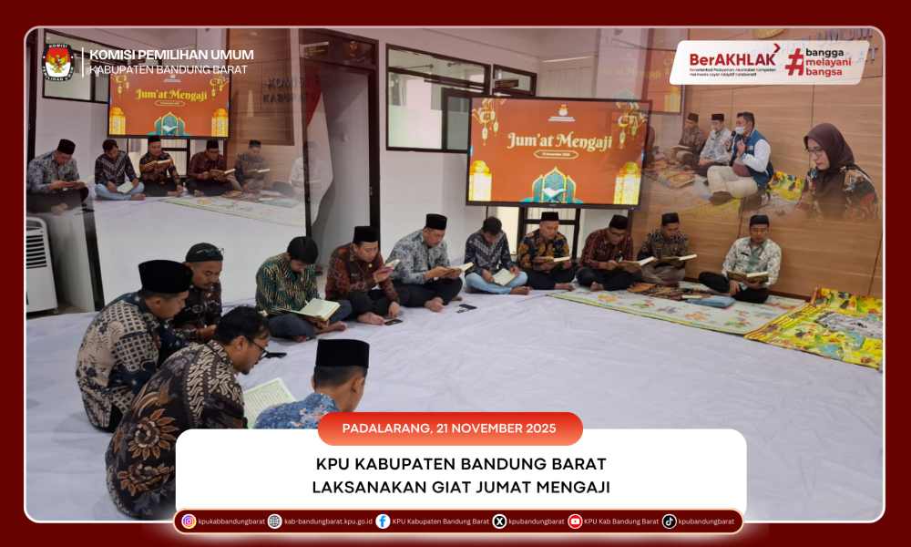 BANDUNG BARAT - KPU Kabupaten Bandung Barat kembali melaksanakan kegiatan Jumat Mengaji pada Jumat, 21 November 2025. Kegiatan ini diikuti oleh Ketua KPU Kabupaten Bandung Barat, Sekretaris, para kepala subbagian, serta para pegawai. Pelaksanaan Jumat Mengaji menjadi salah satu upaya lembaga dalam menghadirkan suasana kerja yang lebih seimbang antara kebutuhan jasmani dan rohani di lingkungan sekretariat.