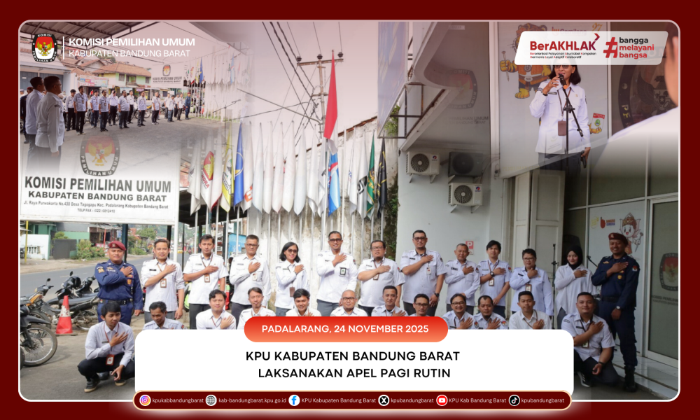 Melalui pelaksanaan apel pagi secara konsisten, diharapkan seluruh pegawai dapat membangun kultur kerja yang disiplin, produktif, dan penuh semangat. KPU Kabupaten Bandung Barat terus berupaya menciptakan lingkungan kerja yang sehat serta mendorong pegawai untuk memberikan kinerja terbaik dalam melayani publik dan menjalankan setiap tahapan penyelenggaraan pemilu maupun kegiatan kelembagaan lainnya.(insan)