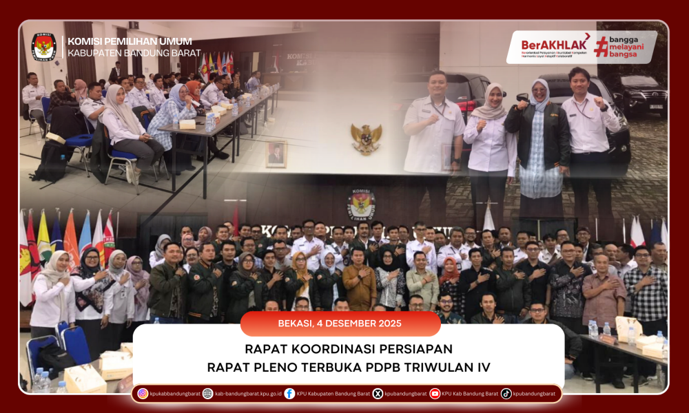 BANUDNG BARAT - KPU Kabupaten Bandung Barat menghadiri Rapat Koordinasi Persiapan Rapat Pleno Terbuka Daftar Pemilih Berkelanjutan (PDPB) Triwulan IV yang diselenggarakan oleh KPU Provinsi Jawa Barat. Kegiatan ini berlangsung pada Kamis, 4 Desember 2025 bertempat di Kantor KPU Kabupaten Bekasi, dan dihadiri oleh perwakilan KPU kabupaten/kota se-Jawa Barat.