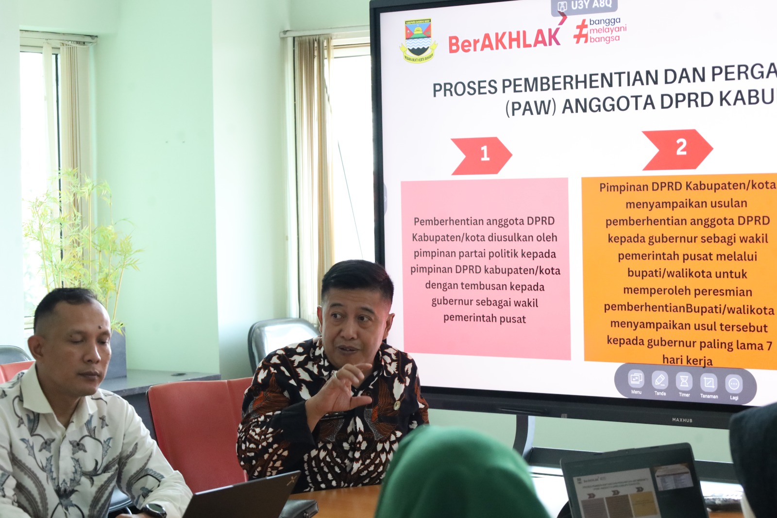 Agenda kedua membahas tata cara Pergantian Antarwaktu (PAW) Anggota DPRD Kabupaten Bandung Barat. Proses PAW merupakan mekanisme penting dalam menjaga keberlanjutan fungsi legislatif, sehingga diperlukan pemahaman dan koordinasi yang selaras antara pemerintah daerah dan lembaga penyelenggara pemilu. KPU Kabupaten Bandung Barat turut memberikan perhatian serius pada agenda ini, mengingat perannya dalam menyiapkan dokumen dan prosedur terkait PAW.