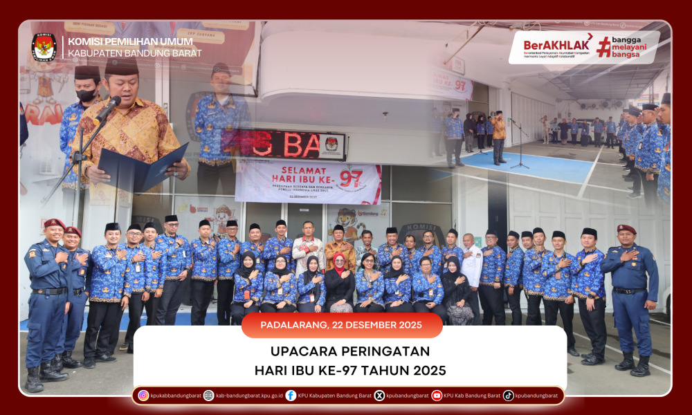 BANDUNG BARAT - Komisi Pemilihan Umum (KPU) Kabupaten Bandung Barat melaksanakan Upacara Peringatan Hari Ibu ke-97 pada Senin, 22 Desember 2025. Kegiatan ini diikuti oleh Ketua KPU Kabupaten Bandung Barat, Anggota KPU, Sekretaris, pejabat fungsional, para kepala subbagian, serta seluruh pegawai di lingkungan KPU Kabupaten Bandung Barat.