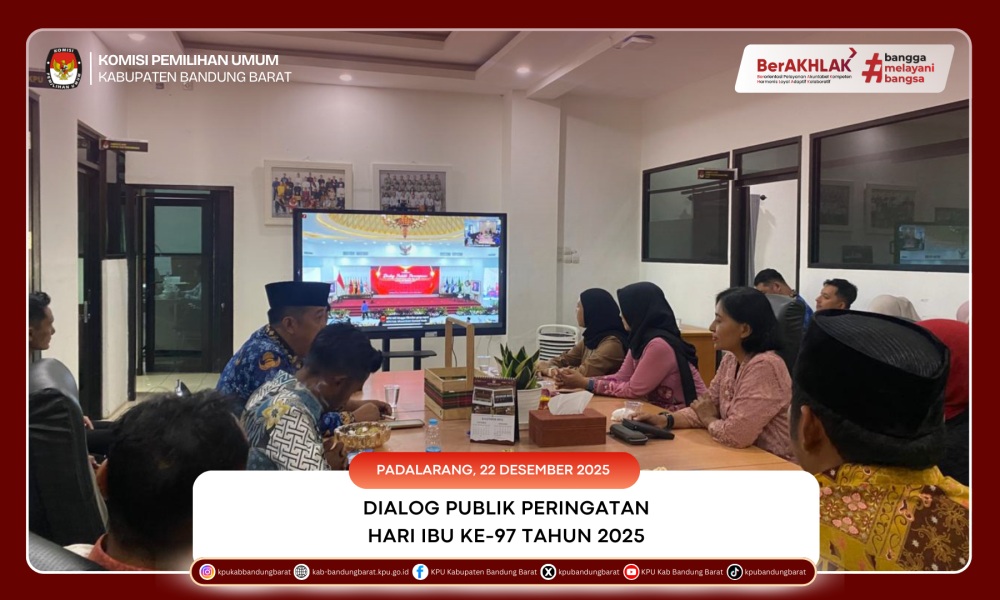BANDUNG BARAT - Komisi Pemilihan Umum (KPU) Kabupaten Bandung Barat mengikuti kegiatan Dialog Publik dalam rangka Peringatan Hari Ibu Ke-97 Tahun 2025 yang diselenggarakan secara daring pada Senin, 22 Desember 2025. Kegiatan ini mengusung tema “Perempuan Penggerak Perubahan: Perempuan Memimpin, Demokrasi Berkembang” sebagai wujud komitmen KPU dalam mendukung peran strategis perempuan dalam kehidupan demokrasi di Indonesia.