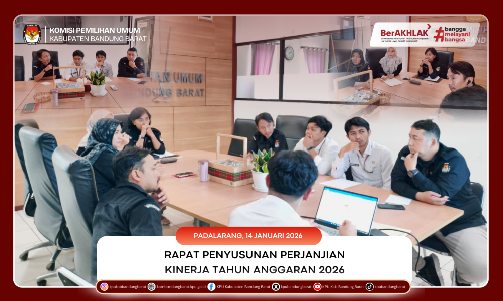 BANDUNG BARAT - Komisi Pemilihan Umum (KPU) Kabupaten Bandung Barat melaksanakan Rapat Penyusunan Perjanjian Kinerja Tahun Anggaran 2026 pada Rabu, 14 Januari 2026. Kegiatan ini merupakan bagian dari upaya penguatan akuntabilitas kinerja dan peningkatan kualitas tata kelola organisasi di lingkungan KPU Kabupaten Bandung Barat, sejalan dengan ketentuan peraturan perundang-undangan yang berlaku.