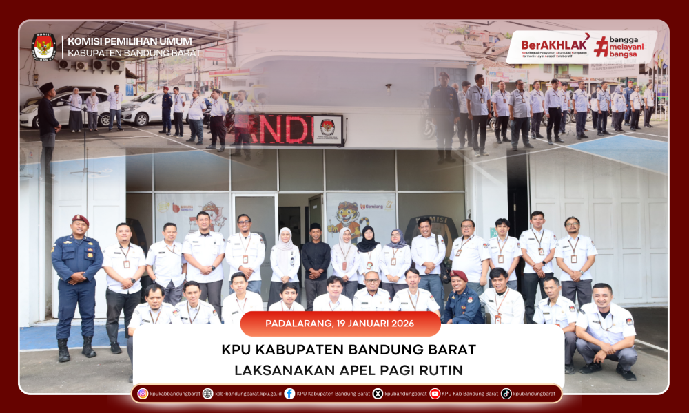 BANDUNG BARAT - Komisi Pemilihan Umum (KPU) Kabupaten Bandung Barat melaksanakan apel pagi rutin pada Senin, 19 Januari 2026. Kegiatan ini diikuti oleh seluruh pegawai KPU Kabupaten Bandung Barat sebagai bagian dari pembinaan kedisiplinan, kebersamaan, serta penguatan nilai-nilai integritas dalam pelaksanaan tugas kelembagaan.