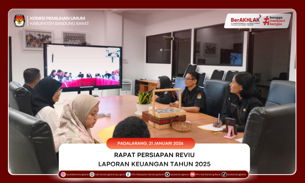 BANDUNG BARAT - Komisi Pemilihan Umum (KPU) Kabupaten Bandung Barat mengikuti Rapat Persiapan Reviu Laporan Keuangan Tahun 2025 (unaudited) yang diselenggarakan secara daring pada Rabu, 21 Januari 2026. Kegiatan ini merupakan bagian dari rangkaian persiapan pelaksanaan reviu atas laporan keuangan guna memastikan akurasi, keandalan, dan kesesuaian penyajian informasi keuangan KPU Tahun Anggaran 2025.