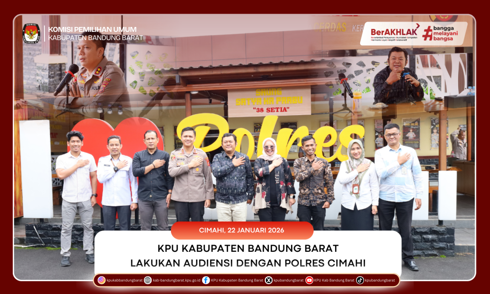 BANDUNG BARAT - Komisi Pemilihan Umum (KPU) Kabupaten Bandung Barat melaksanakan audiensi dengan Polres Cimahi pada Kamis, 22 Januari 2026, bertempat di Markas Polres Cimahi. Kegiatan ini dilaksanakan sebagai upaya penguatan sinergi dan silaturahmi antar lembaga, khususnya dalam mendukung penyelenggaraan tahapan pemilu dan pemilihan yang berintegritas, aman, dan berkelanjutan.