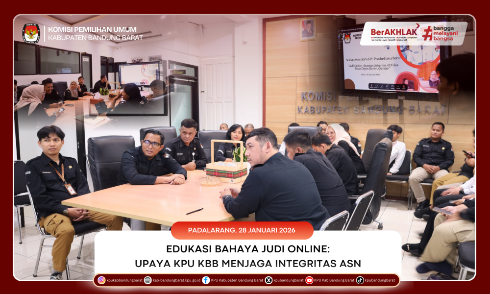 BANDUNG BARAT - Komisi Pemilihan Umum (KPU) Kabupaten Bandung Barat mengikuti kegiatan Zoom bertajuk “Judi Online: Ancaman Integritas ASN dan Masa Depan Karier Aparatur” yang diselenggarakan oleh KPU Provinsi Jawa Barat, pada Rabu, 28 Januari 2026. Kegiatan ini dilaksanakan secara daring dan diikuti oleh Anggota KPU Kabupaten Bandung Barat, Sekretaris, pejabat fungsional, para kepala subbagian, serta seluruh pegawai.