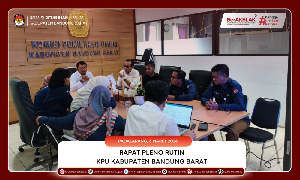 BANDUNG BARAT - Komisi Pemilihan Umum (KPU) Kabupaten Bandung Barat melaksanakan Rapat Pleno Rutin pada Selasa, 3 Maret 2026. Kegiatan ini berlangsung di Ruang Rapat Bayu Baskoro KPU Kabupaten Bandung Barat dan diikuti oleh Ketua KPU Kabupaten Bandung Barat, Anggota KPU, Sekretaris, pejabat fungsional, serta para kepala subbagian (kasubbag).