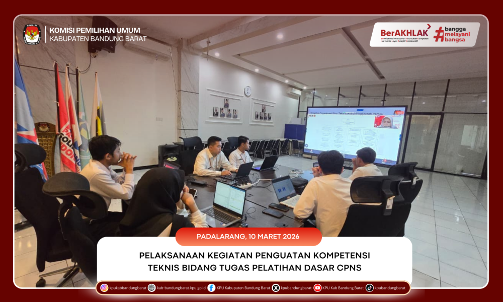 BANDUNG BARAT - Komisi Pemilihan Umum (KPU) Kabupaten Bandung Barat mengikuti kegiatan Penguatan Kompetensi Teknis Bidang Tugas (PKTBT) dalam rangka Pelatihan Dasar (Latsar) Calon Pegawai Negeri Sipil (CPNS) yang diselenggarakan pada tanggal 10–12 Maret 2026. Kegiatan ini dilaksanakan secara daring dan diikuti oleh seluruh CPNS di lingkungan Sekretariat Jenderal KPU Republik Indonesia sebagai bagian dari proses pembentukan kompetensi aparatur sipil negara di lingkungan KPU.