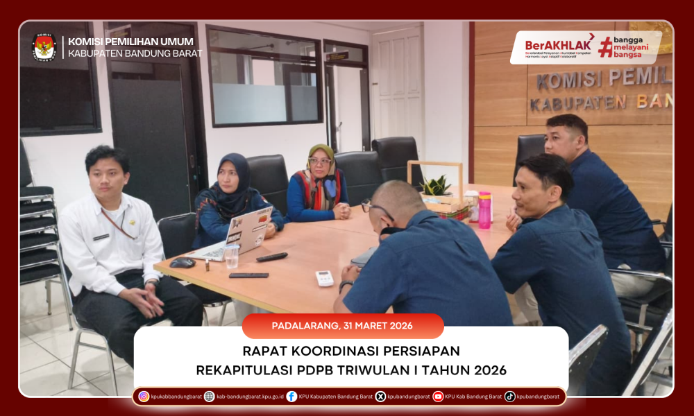BANDUNG BARAT - Komisi Pemilihan Umum (KPU) Kabupaten Bandung Barat mengikuti Rapat Koordinasi Persiapan Rekapitulasi Pemutakhiran Data Pemilih Berkelanjutan (PDPB) Triwulan I Tahun 2026 yang diselenggarakan oleh KPU Provinsi Jawa Barat pada Selasa, 31 Maret 2026. Kegiatan ini dihadiri oleh Kadiv Perencanaan, Data dan Informasi Rini Septiyani, Kasubbag Perencanaan, Data dan Informasi Inike Kusuma Dewi, serta staf subbagian terkait.