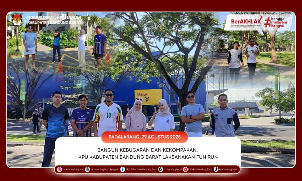 KPU BANDUNG BARAT - Komisi Pemilihan Umum (KPU) Kabupaten Bandung Barat kembali melaksanakan kegiatan rutin Giat Jum’at Sehat pada Jumat (29/8/2025). Kali ini, kegiatan diisi dengan fun run atau lari santai yang berlangsung di area sekitar Kota Baru Parahyangan. Pegawai KPU Kabupaten Bandung Barat turut berpartisipasi dalam kegiatan yang penuh semangat dan kebersamaan ini.