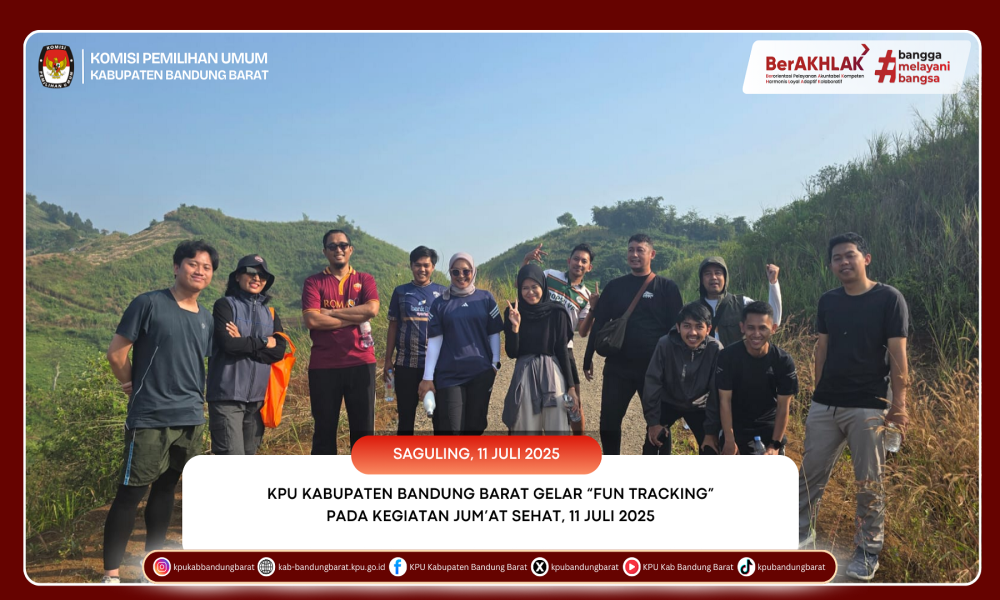 KPU BANDUNG BARAT - Dalam rangka menjaga kebugaran dan mempererat kebersamaan antarpegawai, KPU Kabupaten Bandung Barat kembali menggelar kegiatan Fun Tracking sebagai bagian dari Program Giat Jumat Sehat. Kegiatan ini dilaksanakan pada Jumat pagi, 11 Juli 2025. Kegiatan ini berlokasi di Pasir Ekek, Desa Bojong Haleuang, Kecamatan Saguling, dengan melibatkan unsur pegawai mulai dari staf PNS, PPPK, PPNPN hingga CPNS.