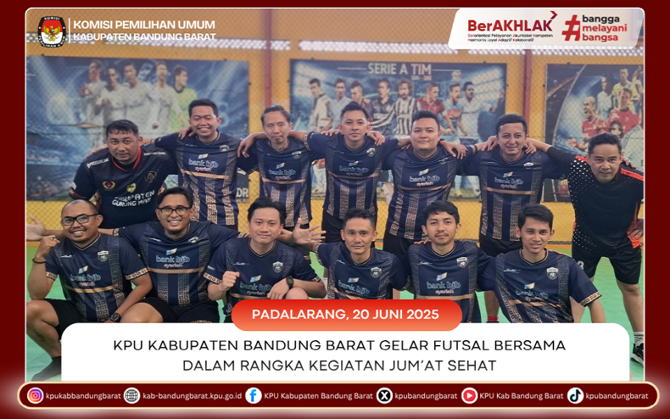 KPU BANDUNG BARAT - Komisi Pemilihan Umum (KPU) Kabupaten Bandung Barat menggelar kegiatan futsal bersama dalam rangkaian program “Giat Jum’at Sehat” yang dilaksanakan di Trend Futsal, Jalan Raya Caringin, Padalarang. Kegiatan ini merupakan bagian dari upaya KPU Kabupaten Bandung Barat untuk meningkatkan kesehatan jasmani dan mempererat hubungan antarpegawai melalui olahraga rutin yang dilaksanakan setiap hari Jumat.