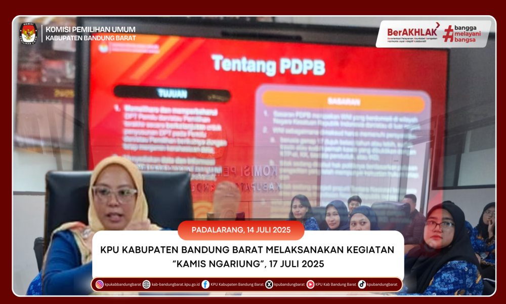 KPU BANDUNG BARAT - Dalam rangka meningkatkan pemahaman internal dan memperkuat kapasitas sumber daya manusia, KPU Kabupaten Bandung Barat menggelar kegiatan sharing knowledge bertajuk “Kemis Ngariung” yang kali ini mengangkat tema Pemutakhiran Daftar Pemilih Berkelanjutan (PDPB). Kegiatan berlangsung pada Kamis, 17 Juli 2025, bertempat di Ruang Rapat Bayu Baskoro, dan diikuti oleh seluruh jajaran pegawai di lingkungan Sekretariat KPU Kabupaten Bandung Barat.