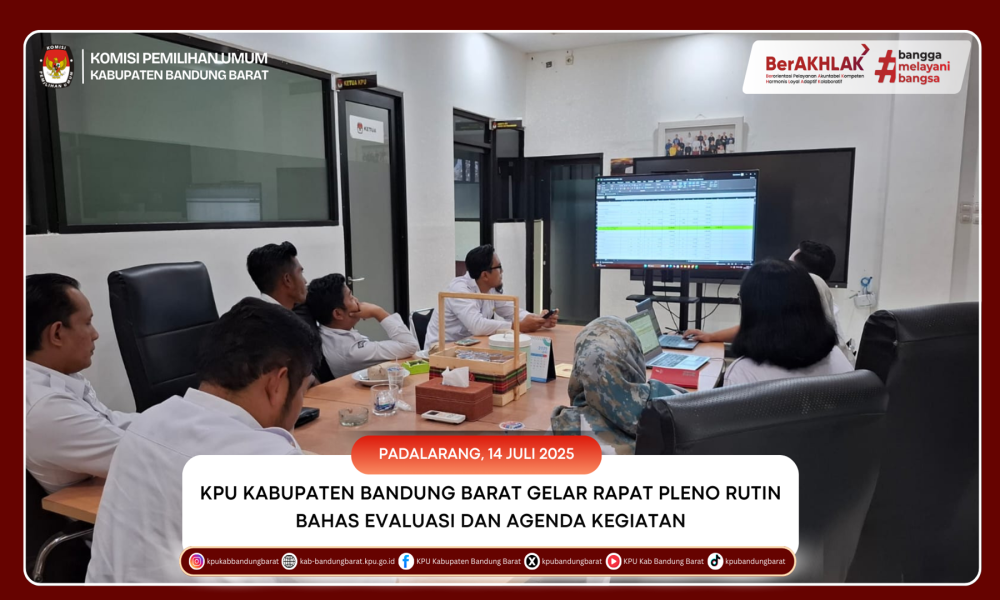 KPU BANDUNG BARAT - Komisi Pemilihan Umum (KPU) Kabupaten Bandung Barat menggelar rapat pleno rutin di Ruang Rapat Bayu Baskoro pada Senin (14/07/2025). Rapat ini dilaksanakan berdasarkan undangan resmi dengan Nomor 191/PP.05.1-Und/3217/2025, yang dihadiri oleh Ketua KPU Kabupaten Bandung Barat Ripqi Ahmad Sulaeman, para Kepala Divisi, Sekretaris, para Kepala Sub Bagian (Kasubag), serta pegawai fungsional di lingkungan KPU Kabupaten Bandung Barat.