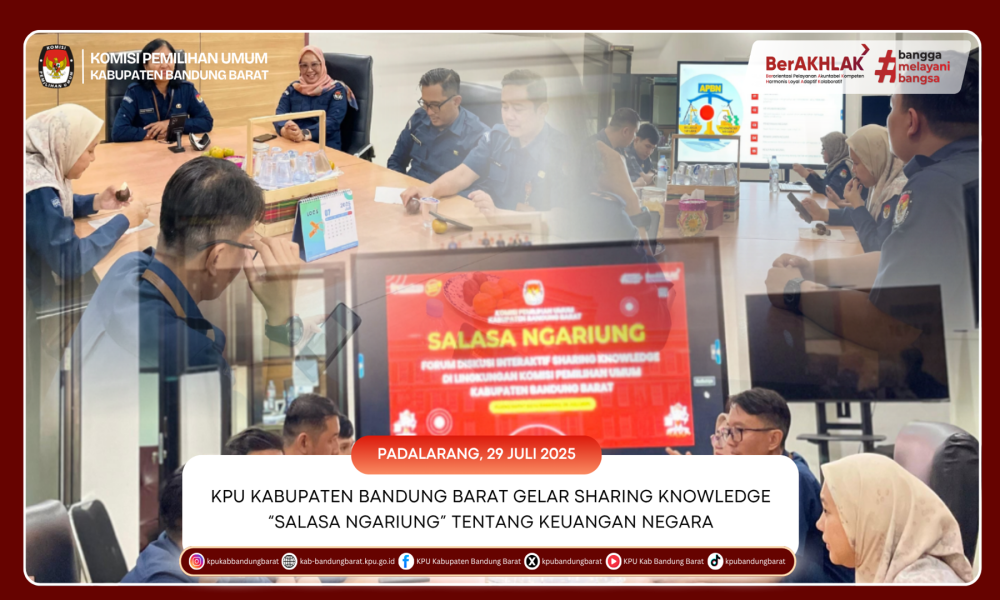 KPU BANDUNG BARAT - Dalam upaya meningkatkan kapasitas dan pemahaman seluruh pegawai terhadap prinsip-prinsip pengelolaan keuangan negara, Komisi Pemilihan Umum (KPU) Kabupaten Bandung Barat menyelenggarakan kegiatan sharing knowledge "Salasa Ngariung" bertema Keuangan Negara. Kegiatan ini berlangsung di Ruang Rapat Bayu Baskoro dan dihadiri oleh jajaran Sekretariat KPU, termasuk Sekretaris, para Kepala Subbagian (Kasubag), serta seluruh pegawai dari unsur PNS, PPPK, PPNPN, hingga CPNS.