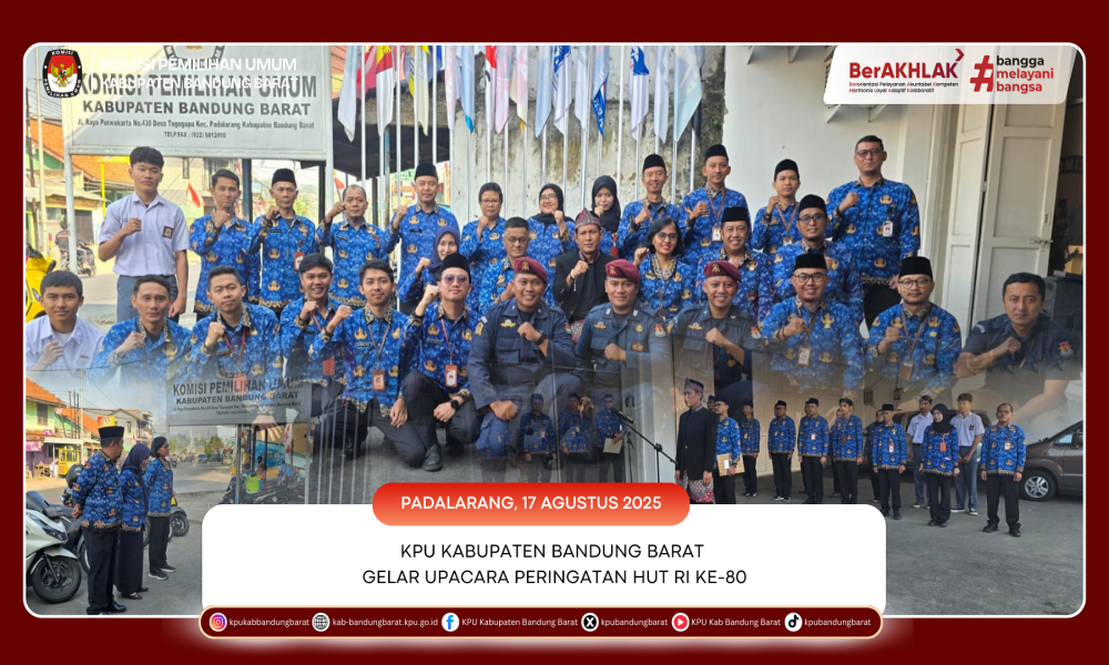 KPU BANDUNG BARAT - Komisi Pemilihan Umum (KPU) Kabupaten Bandung Barat menyelenggarakan upacara peringatan Hari Ulang Tahun (HUT) ke-80 Republik Indonesia pada Minggu, 17 Agustus 2025, bertempat di halaman Kantor KPU Kabupaten Bandung Barat. Kegiatan tersebut diikuti oleh seluruh jajaran anggota KPU, Sekretaris KPU, para kepala subbagian (kasubag), serta seluruh pegawai dengan penuh semangat kebangsaan.