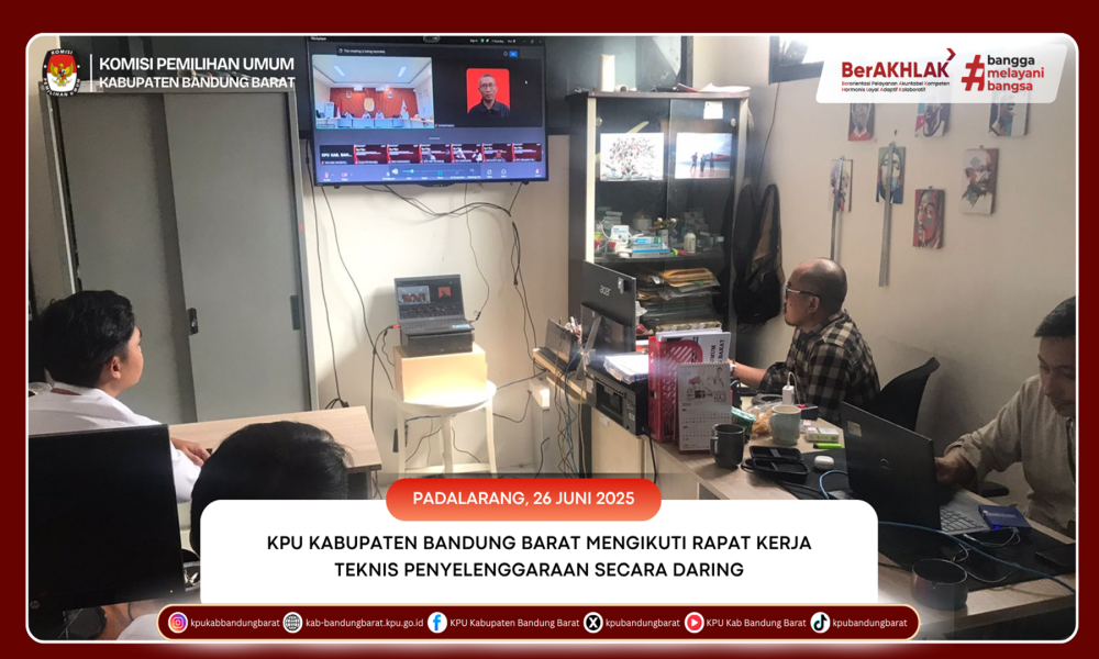 KPU BANDUNG BARAT - Komisi Pemilihan Umum (KPU) Kabupaten Bandung Barat menghadiri Rapat Kerja Teknis Penyelenggaraan yang diselenggarakan secara daring melalui Zoom Meeting pada Kamis, 26 Juni 2025. Kegiatan ini diikuti oleh Anggota KPU Kabupaten/Kota yang membidangi Divisi Teknis Penyelenggaraan, serta Kepala Sub Bagian Teknis Penyelenggaraan Pemilu dan Hukum pada Sekretariat KPU Kabupaten/Kota se-Jawa Barat.