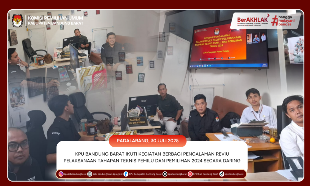 KPU BANDUNG BARAT - Komisi Pemilihan Umum (KPU) Kabupaten Bandung Barat turut serta dalam kegiatan berbagi pengalaman dalam rangka Reviu Pelaksanaan Tahapan Teknis Pemilu dan Pemilihan Tahun 2024 yang diselenggarakan secara daring oleh KPU Republik Indonesia pada Rabu, 30 Juli 2025.