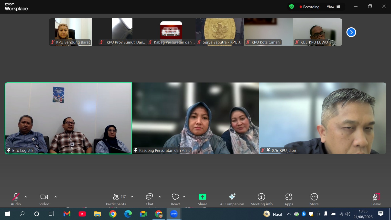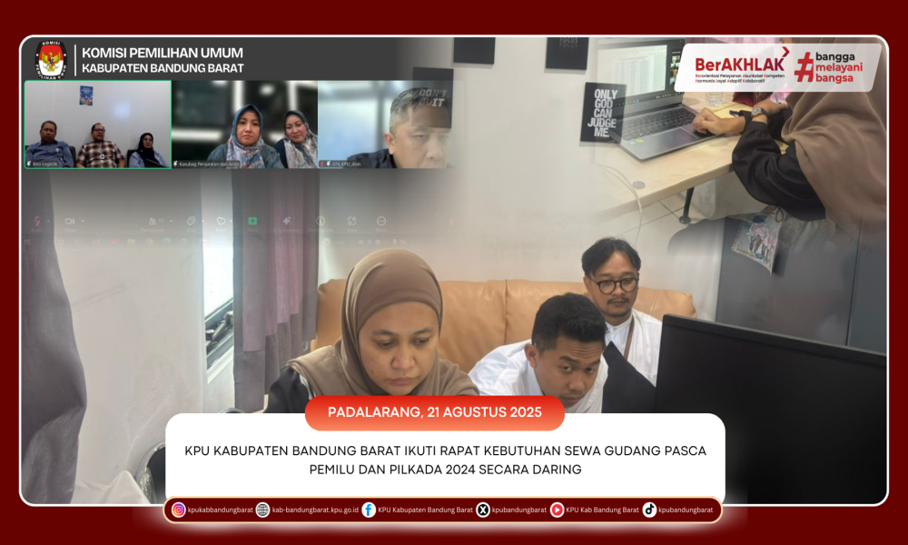 KPU BANDUNG BARAT - Komisi Pemilihan Umum (KPU) Kabupaten Bandung Barat melalui Kepala Subbagian Keuangan, Umum, dan Logistik, Siti Nani Aisyah beserta staf, mengikuti rapat pembahasan kebutuhan sewa gudang pasca penyelenggaraan Pemilu dan Pilkada Serentak Tahun 2024. Rapat ini digelar pada Kamis (21/8/2025) dan diikuti oleh sejumlah satuan kerja KPU se-Indonesia.