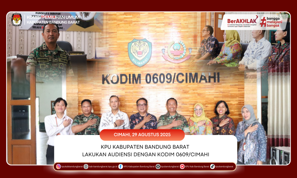 KPU BANDUNG BARAT - Komisi Pemilihan Umum (KPU) Kabupaten Bandung Barat melaksanakan audiensi dengan Komando Distrik Militer (Kodim) 0609/Cimahi pada Jumat (29/8/2025). Kegiatan ini berlangsung dalam suasana penuh keakraban dan bertujuan memperkuat koordinasi serta sinergitas antara kedua lembaga dalam rangka mendukung kelancaran pelaksanaan tahapan kepemiluan.
