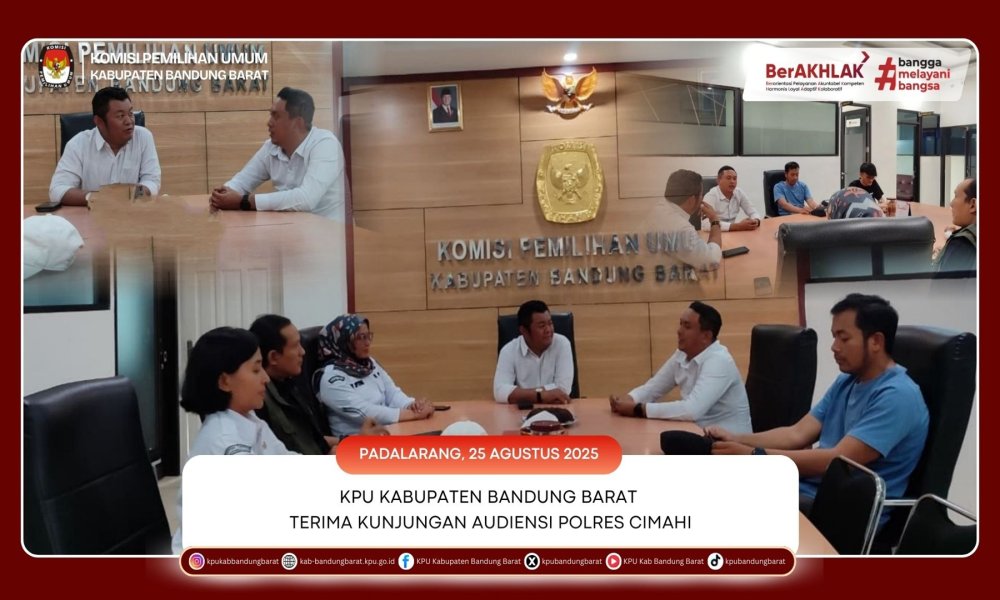 KPU BANDUNG BARAT - Komisi Pemilihan Umum (KPU) Kabupaten Bandung Barat menerima kunjungan audiensi dari jajaran Polres Cimahi pada Senin (25/8/2025). Pertemuan yang berlangsung di Ruang Rapat Bayu Baskoro ini dihadiri langsung oleh Ketua KPU Kabupaten Bandung Barat beserta para anggota dan Sekretaris KPU.