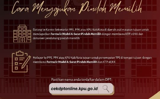 Menurutnya, cara pindah memilih ini bisa dilakukan dengan dua cara yakni datang ke Kantor Sekretariat PPS, PPK atau KPU Kab/Kota di daerah asal maupun tujuan.
