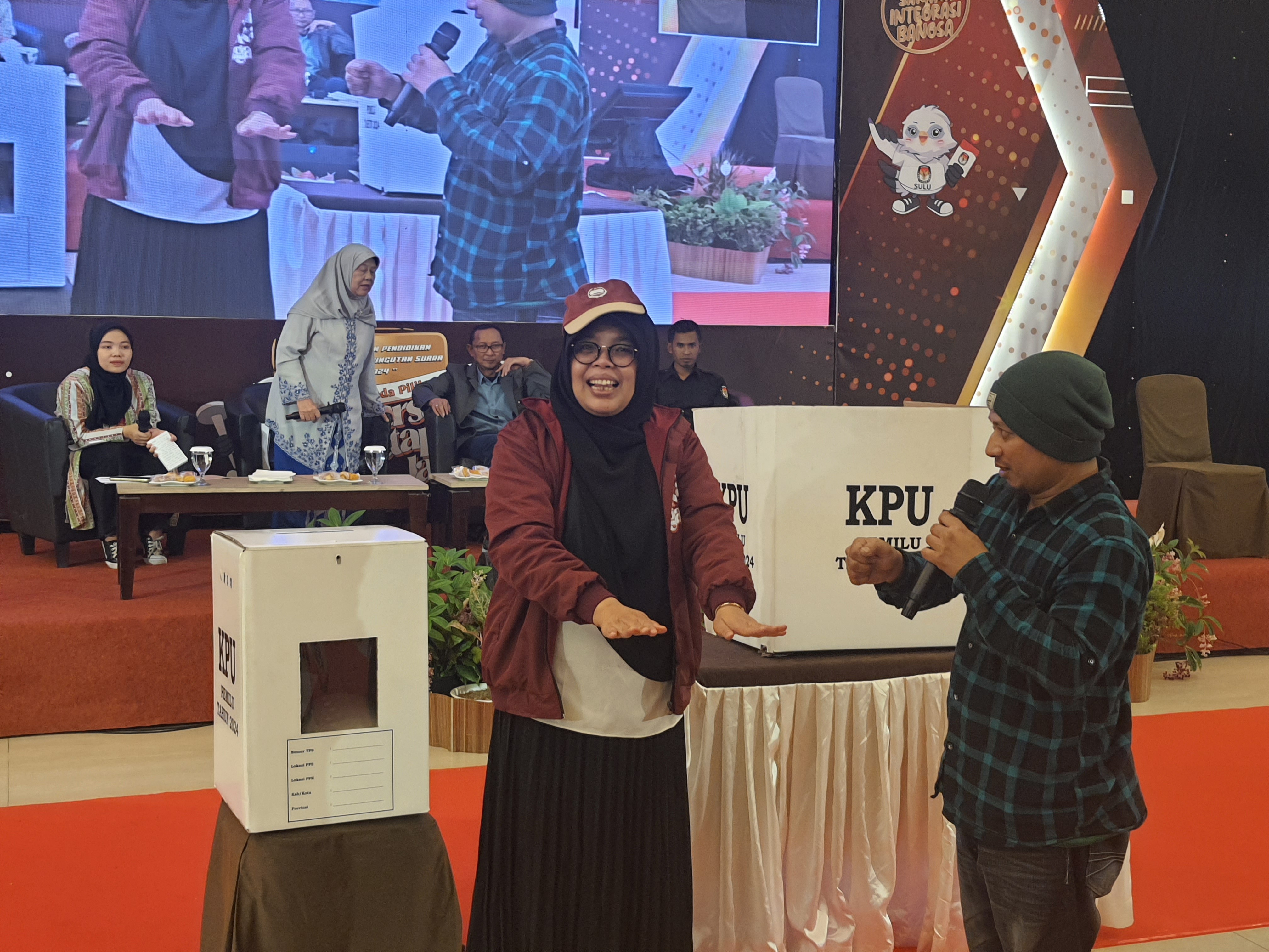 Tak hanya mendapatkan informasi tentang kepemiluan, mereka juga mengikuti simulasi tentang cara menyalurkan hak pilihnya dengan didampingi petugas.