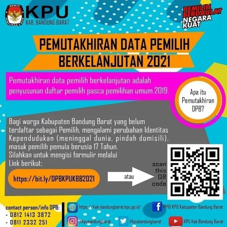 Bagi warga Kabupaten Bandung Barat yang belum terdaftar sebagai Pemilih, mengalami perubahan Identitas Kependudukan (meninggal dunia, pindah domisili), masuk Pemilih Pemula berusia 17 tahun. Silahkan untuk mengisi formulir melalui Link berikut: https://bit.ly/DPBKPUKBB2021