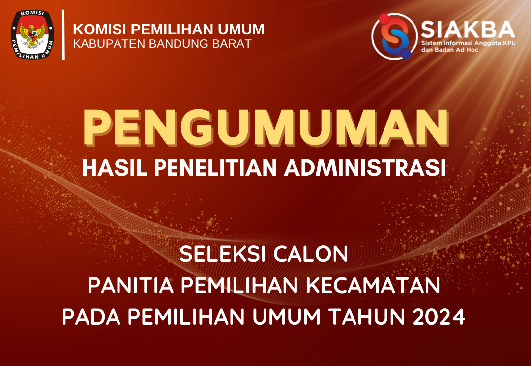 kab-bandungbarat.kpu.go.id Berdasarkan Berita Acara Komisi Pemilihan Umum Kabupaten Bandung Barat Nomor 68/PP.04.1-BA/3217/2022 tanggal 1 Desember 2022 tentang Hasil Penelitian Administrasi Calon Anggota Panitia Pemilihan Kecamatan (PPK) pada Pemilihan Umum Tahun 2024, maka dapat kami sampaikan hal-hal sebagai berikut :