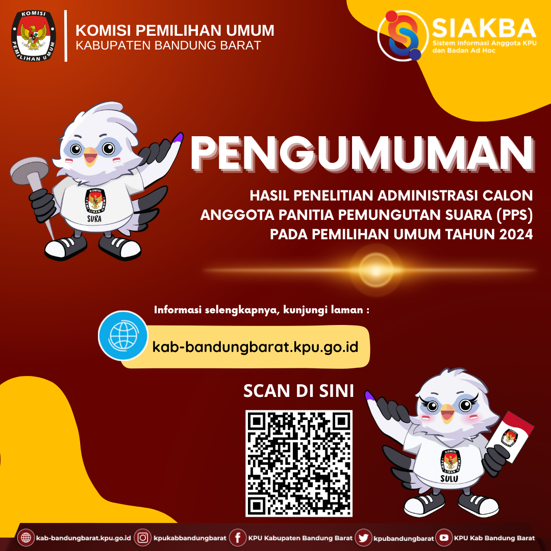 kab-bandungbarat.kpu.go.id - Berdasarkan Berita Acara Komisi Pemilihan Umum Kabupaten Bandung Barat Nomor 01/PP.04.1-BA/3217/2023 tanggal 6 Januari 2023 tentang Hasil Penelitian Administrasi Calon Anggota Panitia Pemungutan Suara (PPS) pada Pemilihan Umum Tahun 2024, maka dapat kami sampaikan hal-hal sebagai berikut :