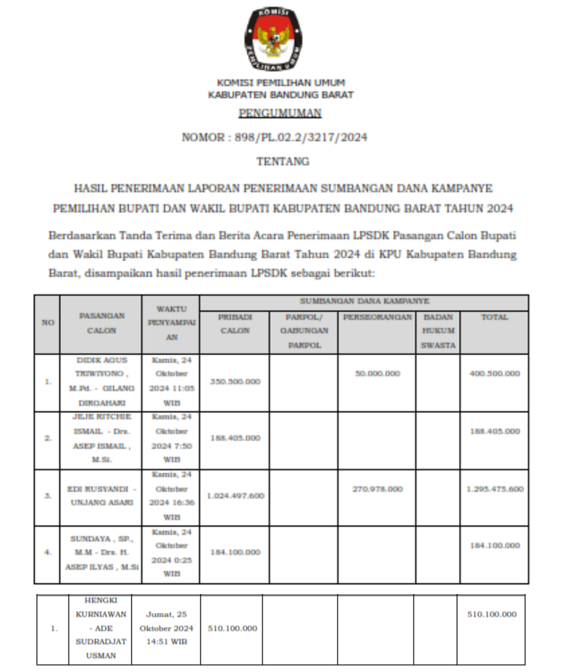 PENGUMUMAN NOMOR : 898/PL.02.2/3217/2024 TENTANG HASIL PENERIMAAN LAPORAN PENERIMAAN SUMBANGAN DANA KAMPANYE PEMILIHAN BUPATI DAN WAKIL BUPATI KABUPATEN BANDUNG BARAT TAHUN 2024 dan PENGUMUMAN NOMOR : 899/PL.02.2/3217/2024 TENTANG HASIL PENERIMAAN LAPORAN PENERIMAAN SUMBANGAN DANA KAMPANYE PERBAIKAN PEMILIHAN BUPATI DAN WAKIL BUPATI KABUPATEN BANDUNG BARAT TAHUN 2024.