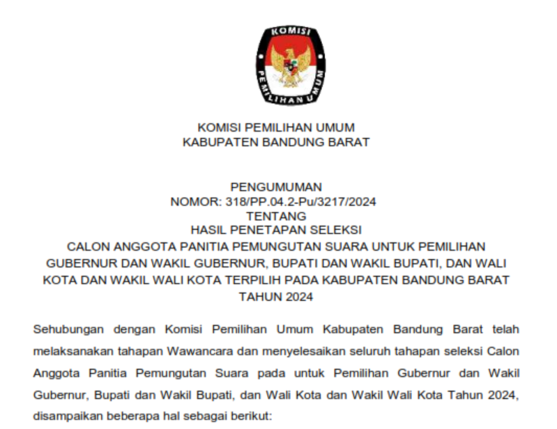 Pengumuman Nomor: 318/PP.04.2-Pu/3217/2024 Tentang Hasil Penetapan Seleksi Calon Anggota Panitia Pemungutan Suara Untuk Pemilihan Gubernur Dan Wakil Gubernur, Bupati Dan Wakil Bupati, Dan Wali Kota Dan Wakil Wali Kota Terpilih Pada Kabupaten Bandung Barat Tahun 2024