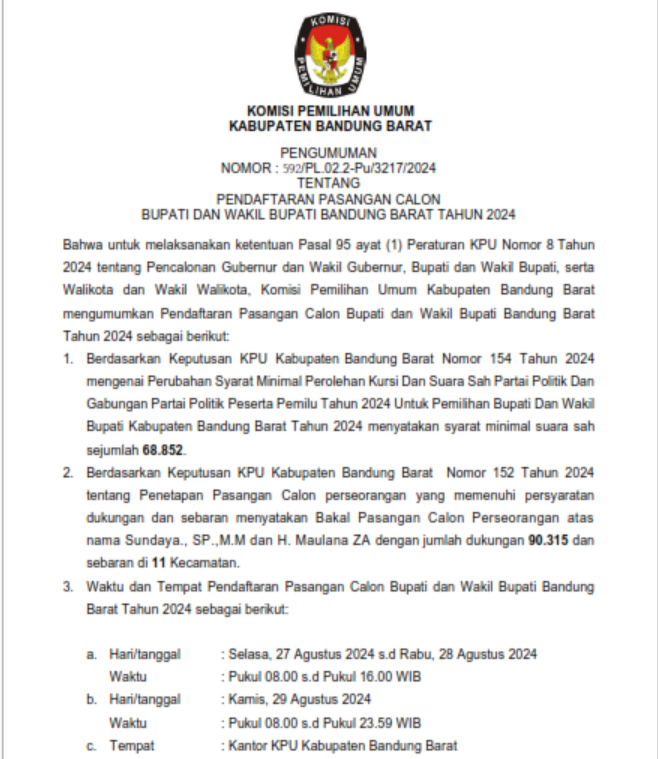 Pengumuman Nomor : 592/PL.02.2-Pu/3217/2024 Tentang Pendaftaran Pasangan Calon Bupati Dan Wakil Bupati Bandung Barat Tahun 2024