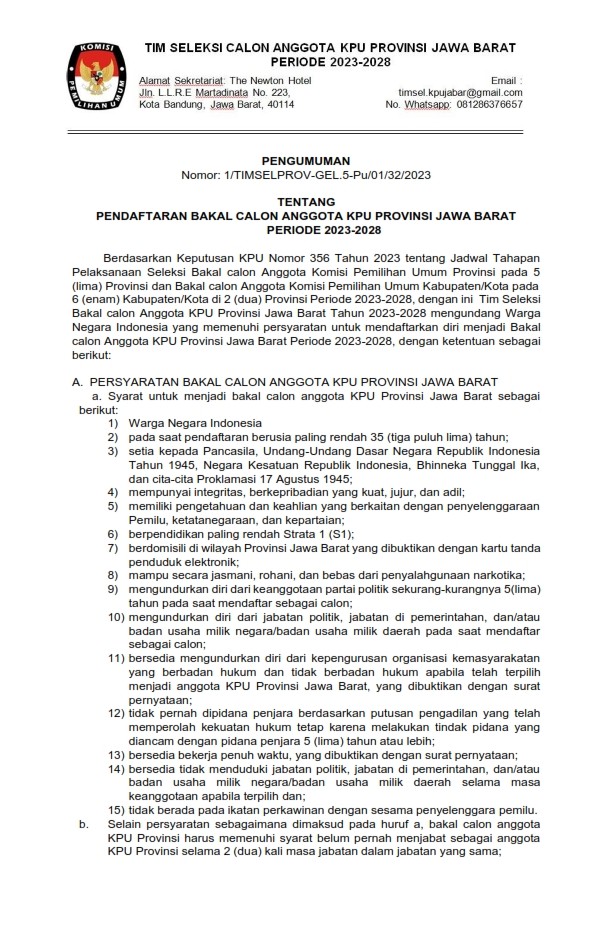 Pengumuman Seleksi Calon Anggota Komisi Pemilihan Umum Provinsi Jawa Barat Periode 2023-2028.